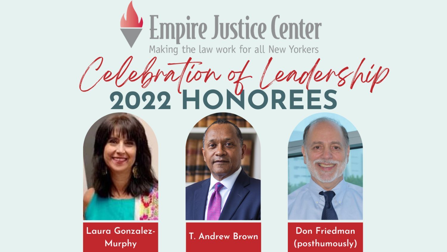 Empire Justice Center's signature fundraising event, a Celebration of Leadership, is less than one month away! Join us on Thursday, November 17 from 5:30-8:30 PM to recognize leaders in New York State for their contributions to access to justice. We'll celebrate the accomplishments of T. Andrew Brown, Laura Gonzalez-Murphy and, posthumously, Empire Justice Center alum, and social justice advocate, Don Friedman with cocktails, hors d'oeuvres and networking at the Cornerstone at the Plaza in downtown Albany. Sponsor the event or place an ad in the event journal by clicking HERE. Sponsorships come with many benefits and support the critical work that Empire Justice Center does statewide by raising unrestricted funding for systemic work that is vital to making the law work for all New Yorkers. About the Honorees T. Andrew Brown is a Founder and Managing Partner of Rochester-based Brown Hutchinson LLP. He served as the Corporation Counsel for the City of Rochester, Deputy County Attorney for Monroe County, Advisor to the County Executive, former General Counsel of the National Bar Association, and is past President of the Monroe County Bar Association, the Rochester Black Bar Association and the New York State Bar Association. Laura Gonzalez-Murphy is the Executive Director of the NYS Office for New Americans (ONA), and previously was the Director of NY State Immigration Policy and Research, serving as lead policy advisor on the State's response to federal immigration policies. She is also a former Empire Justice Board Member. Laura has led the design and implementation of unique programs that empower immigrant families and provide critical resources. Don Friedman was the inaugural managing attorney and founder of Empire Justice Center’s Long Island office at the Public Advocacy Center on the Touro Law School campus from 2007 until his retirement in May 2020. Don was a well-known name among welfare advocates across the state. His depth of knowledge, combined with his spot-on sense of humor, always drew crowds to his training sessions. Don dedicated his life to empowering underserved communities and advocating on behalf of low-income people from the day he left Harvard Law School in 1977. |